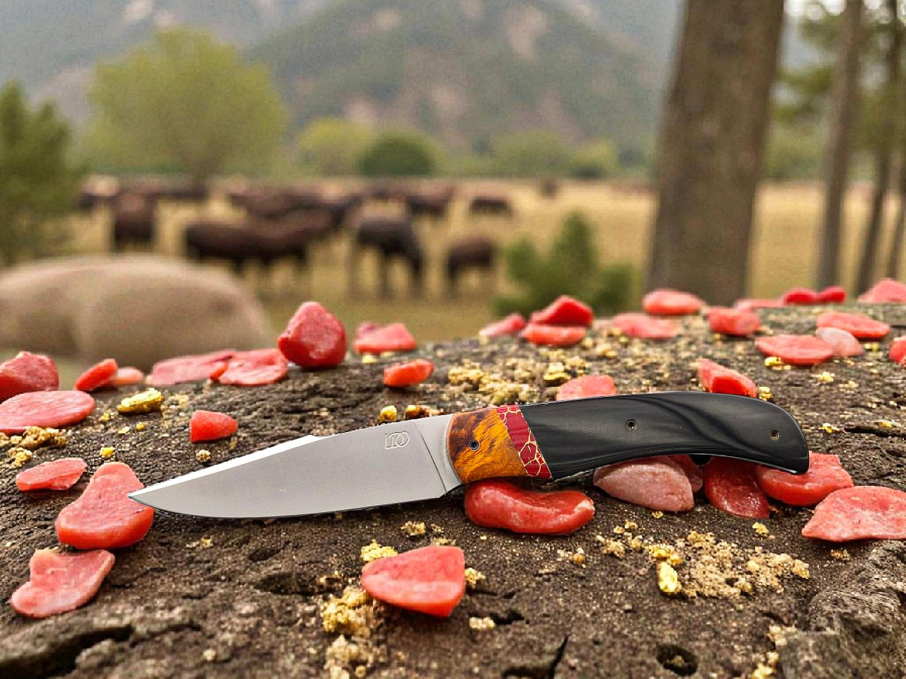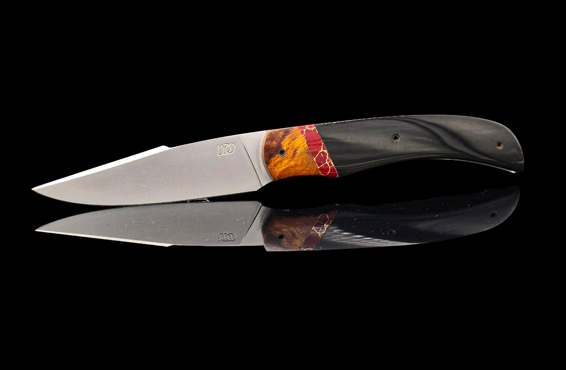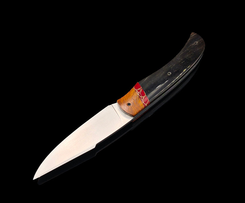 Manche en loupe de bois de fer d'Arizona, Jaspe rouge et fils d'or, corne de buffle.