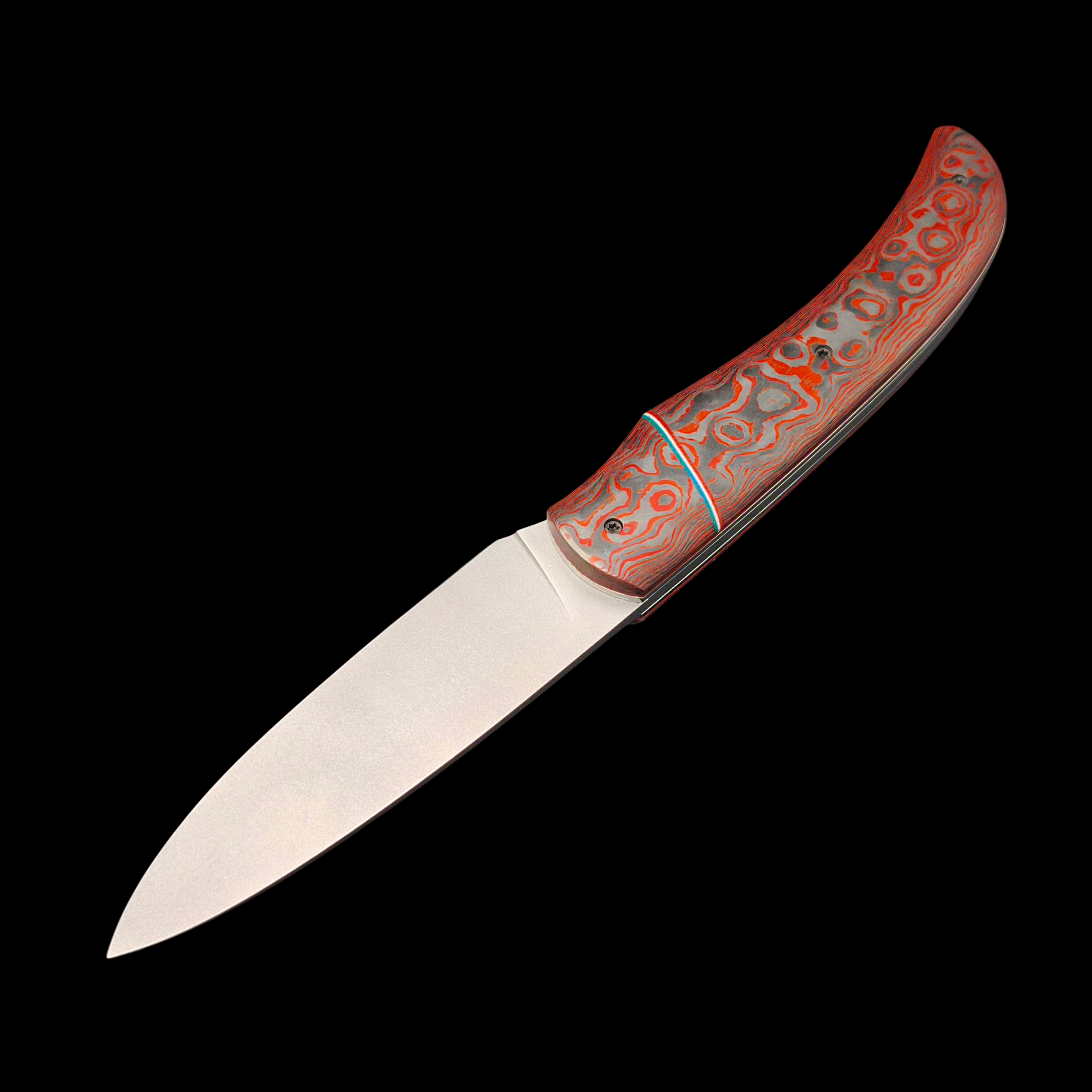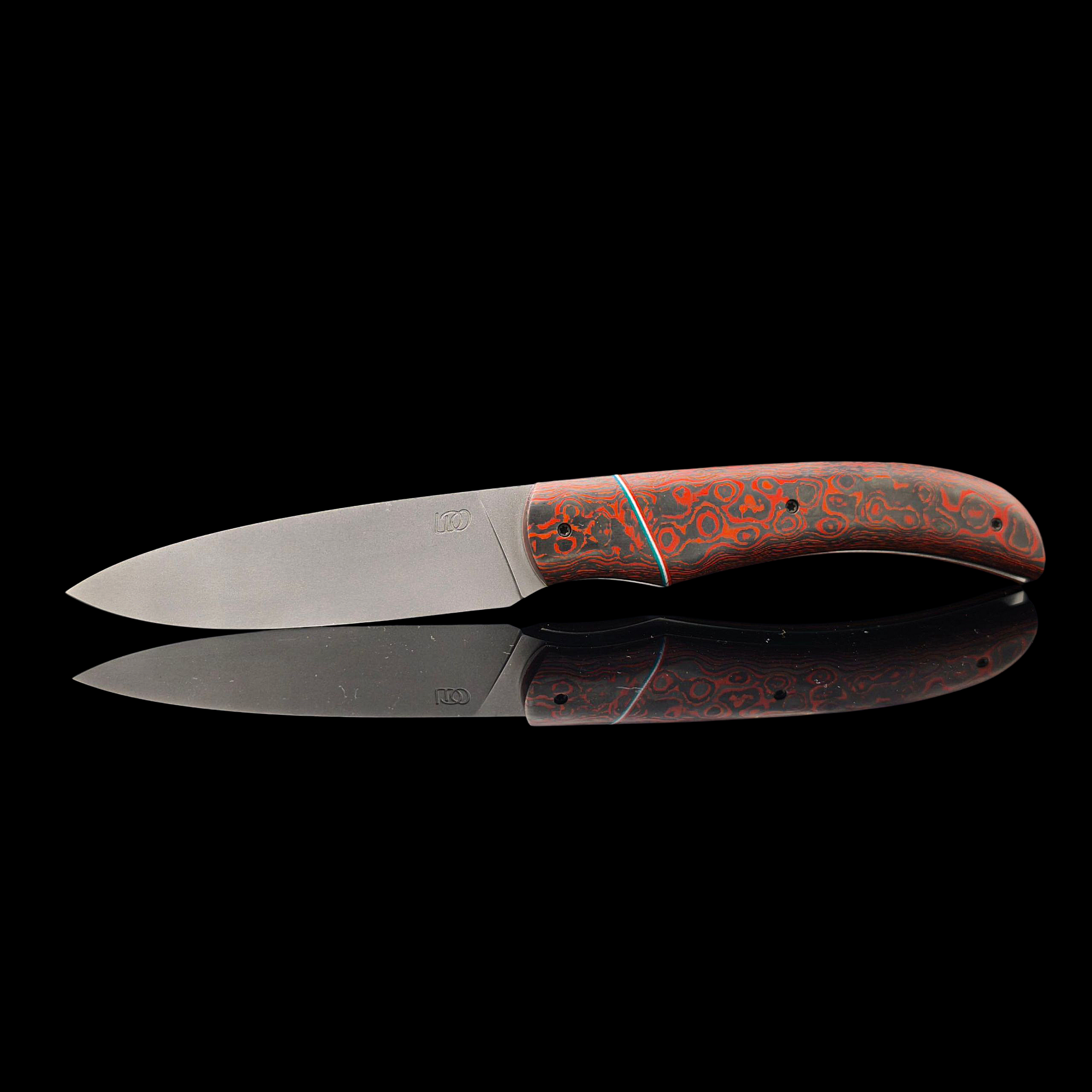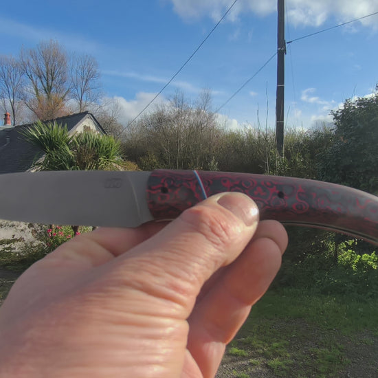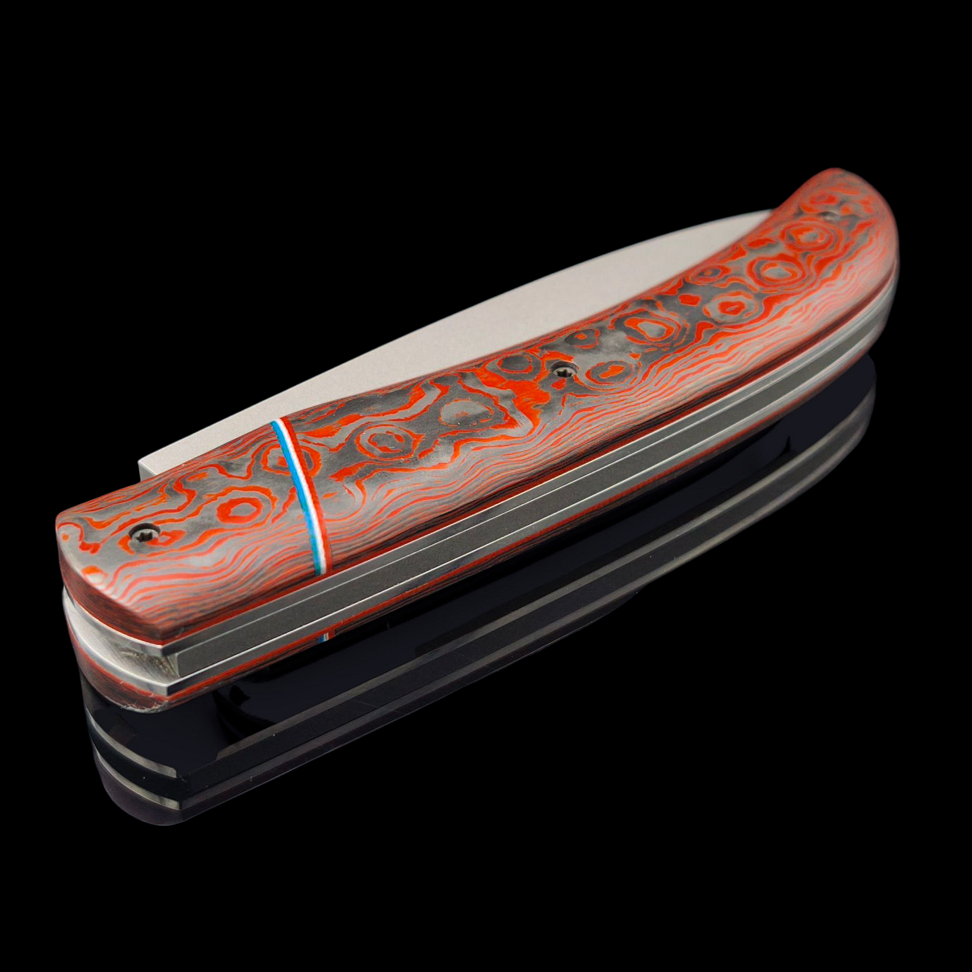 Le manche en carbone rouge, éclatant et vibrant, évoque la flamme maîtrisée, celle du feu qui éclaire autant qu’il consume.
