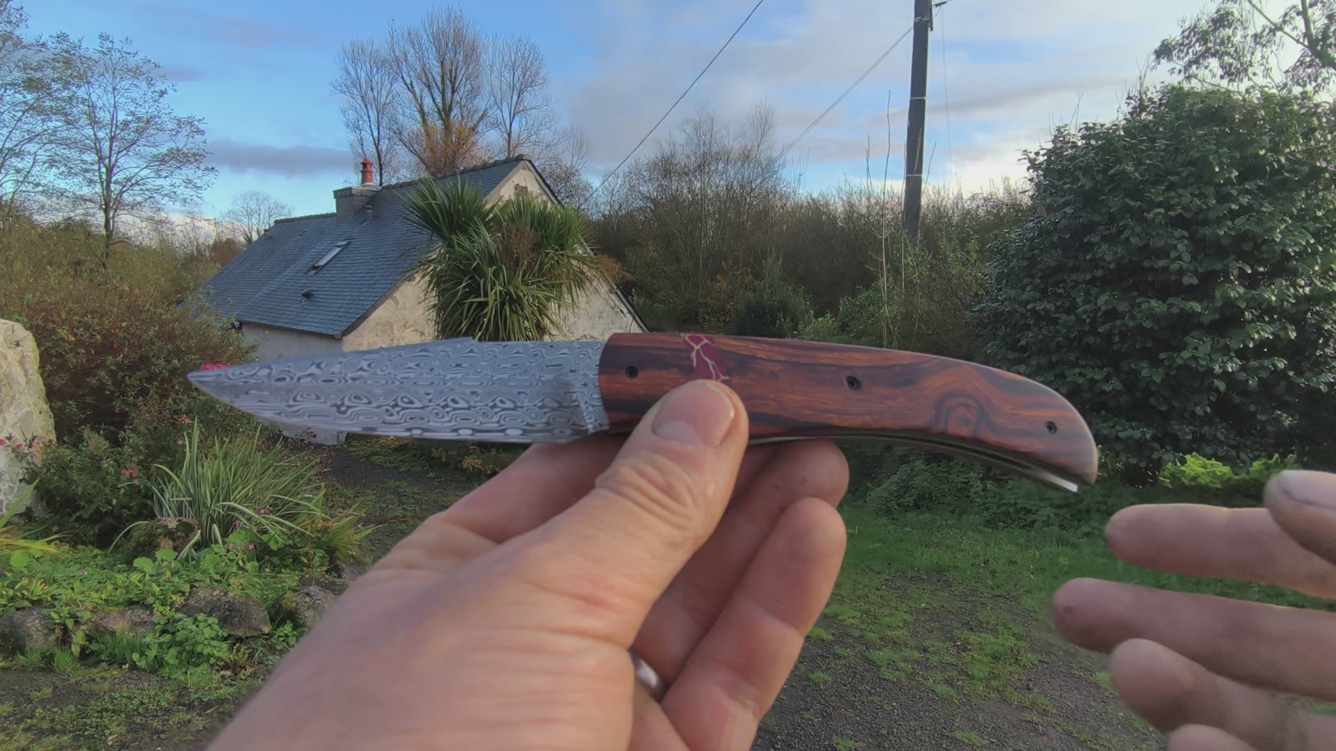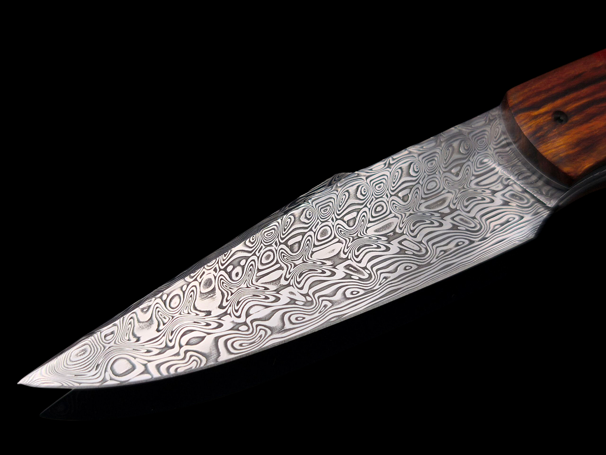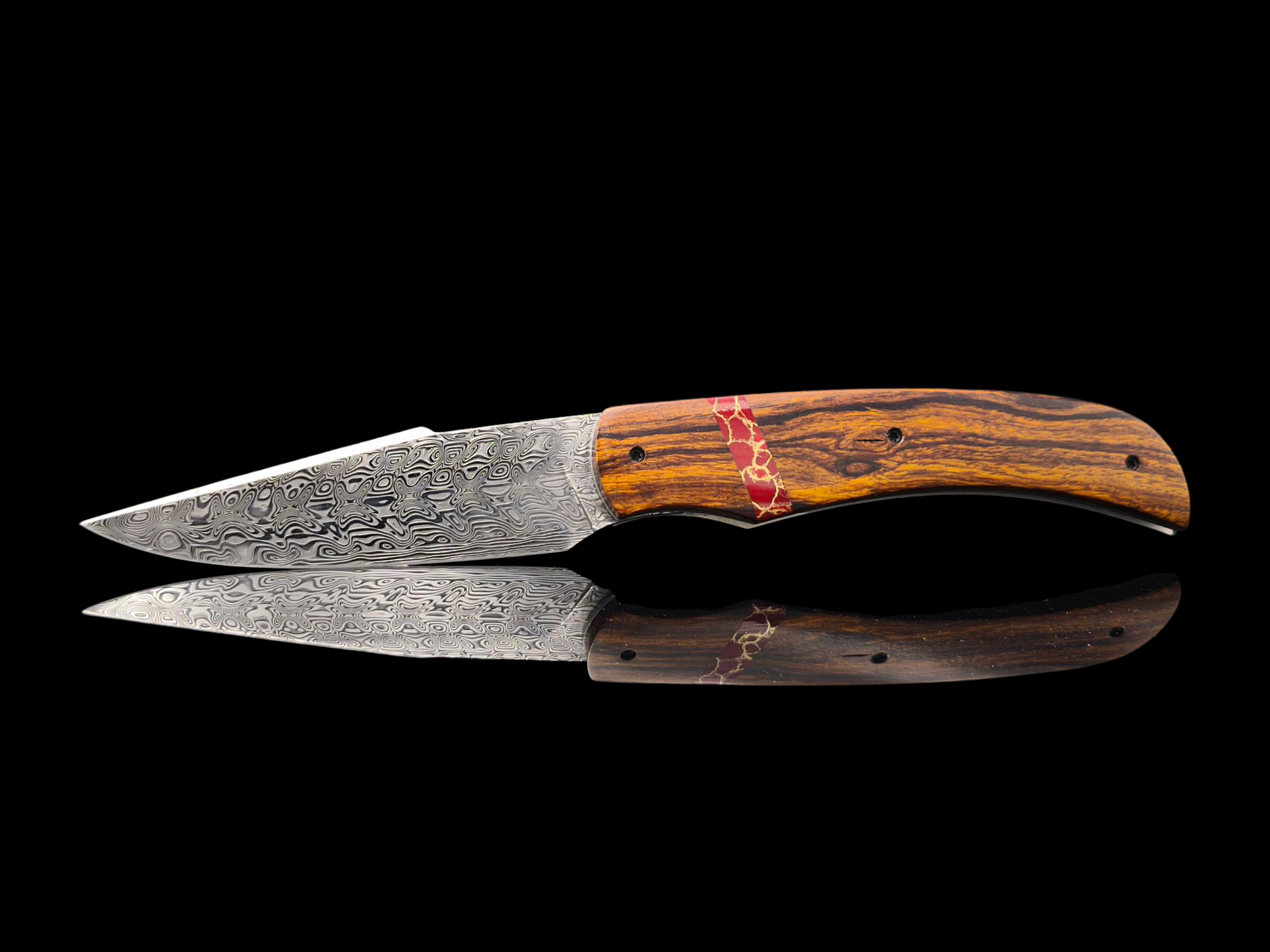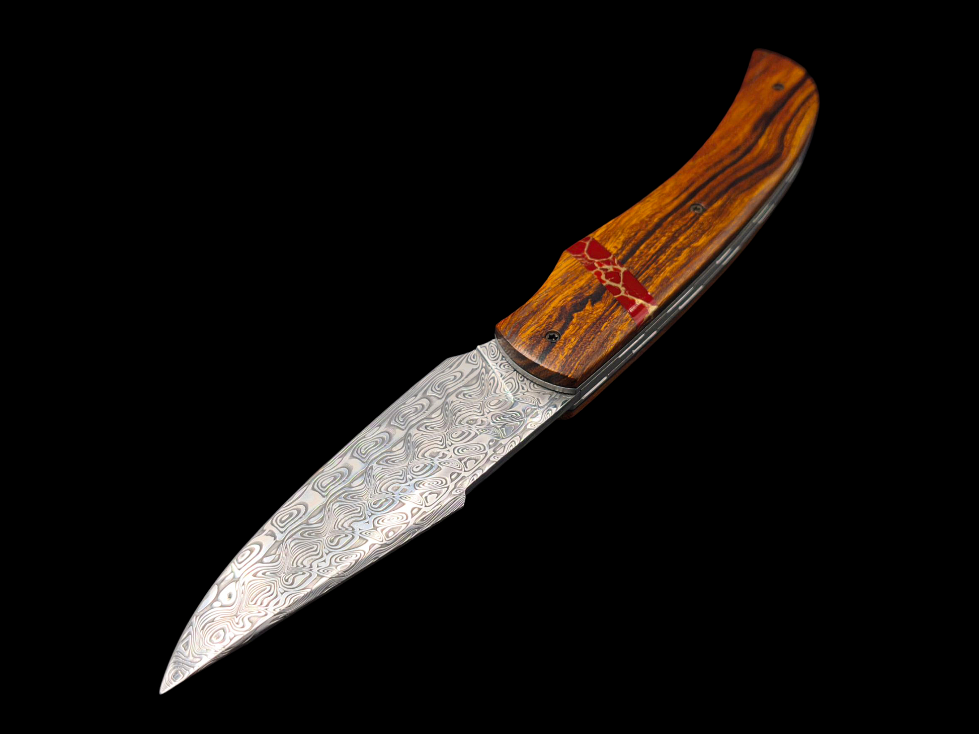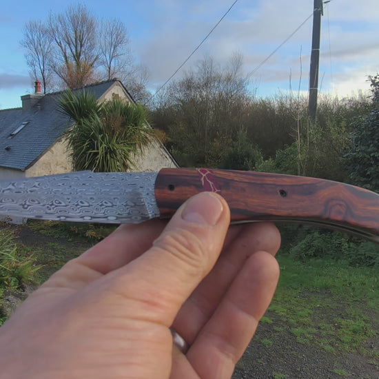 Sa lame en damas, aux motifs hypnotiques, évoque les visions chamaniques — ondulations mouvantes, reflets vibrants, comme les mirages d’un monde sacré entre rêve et réalité.
