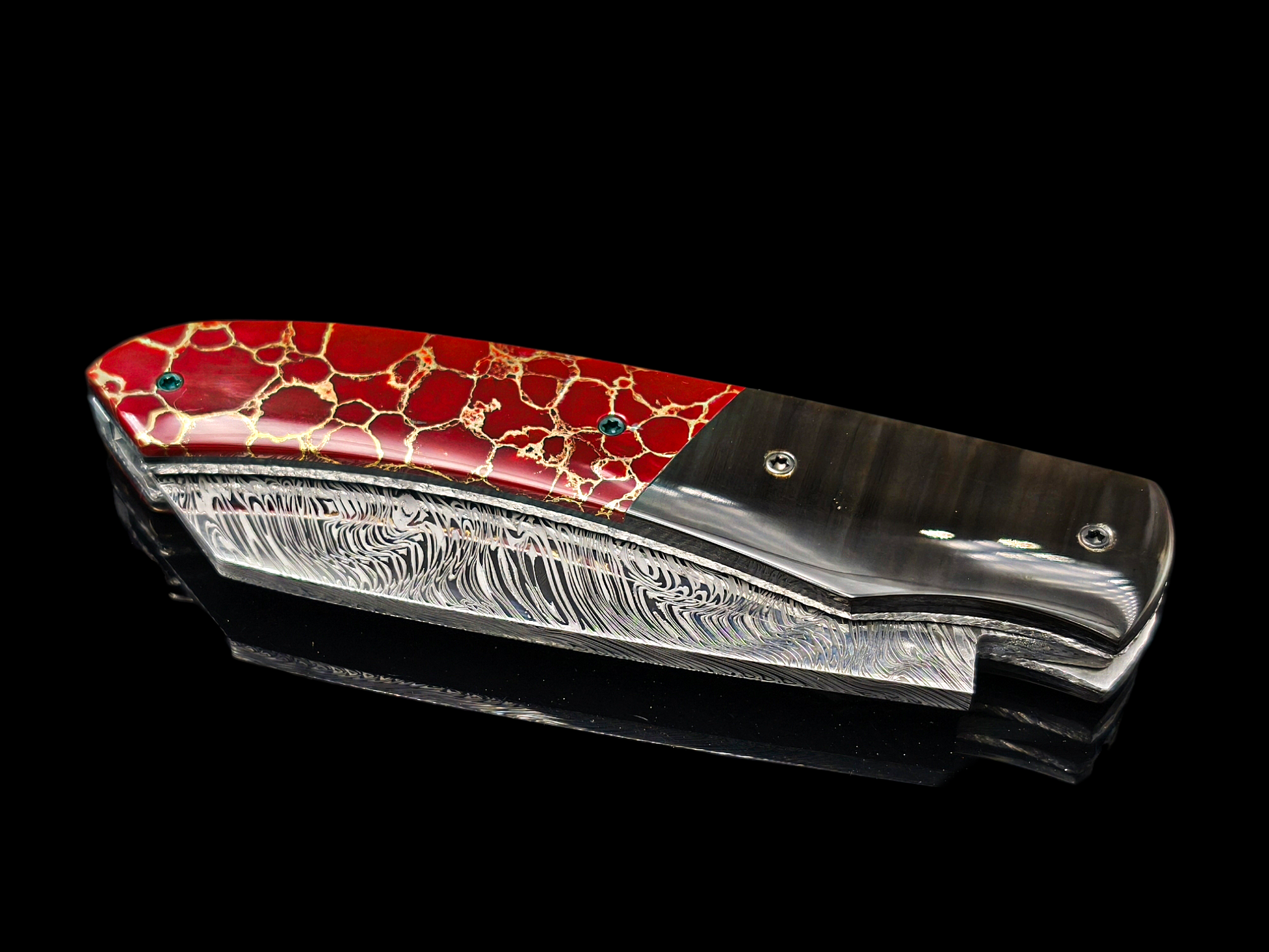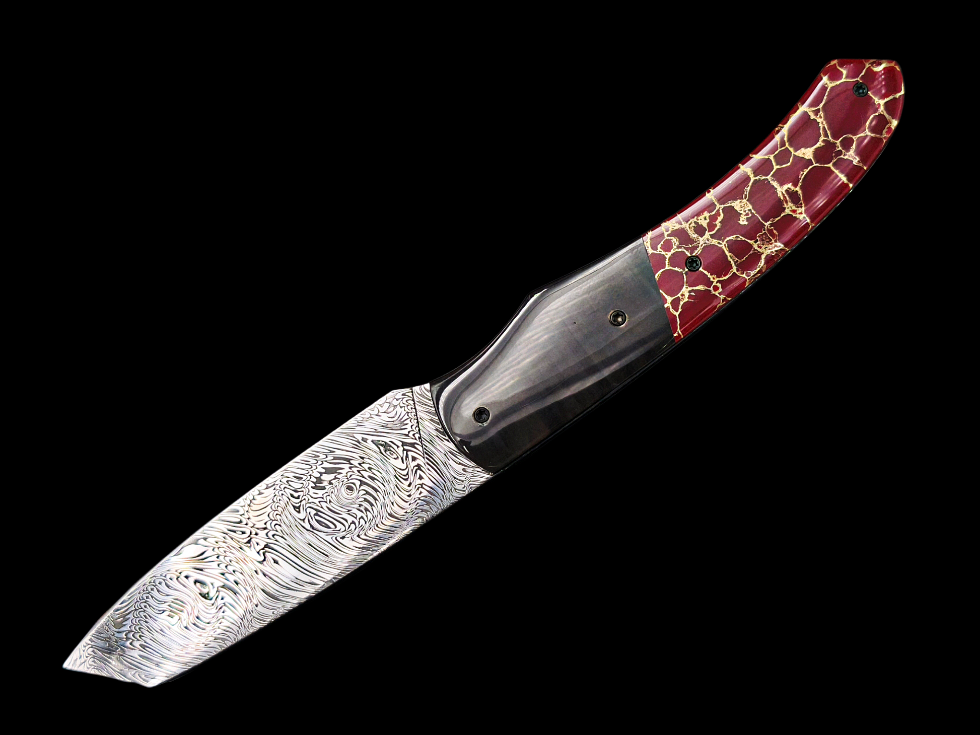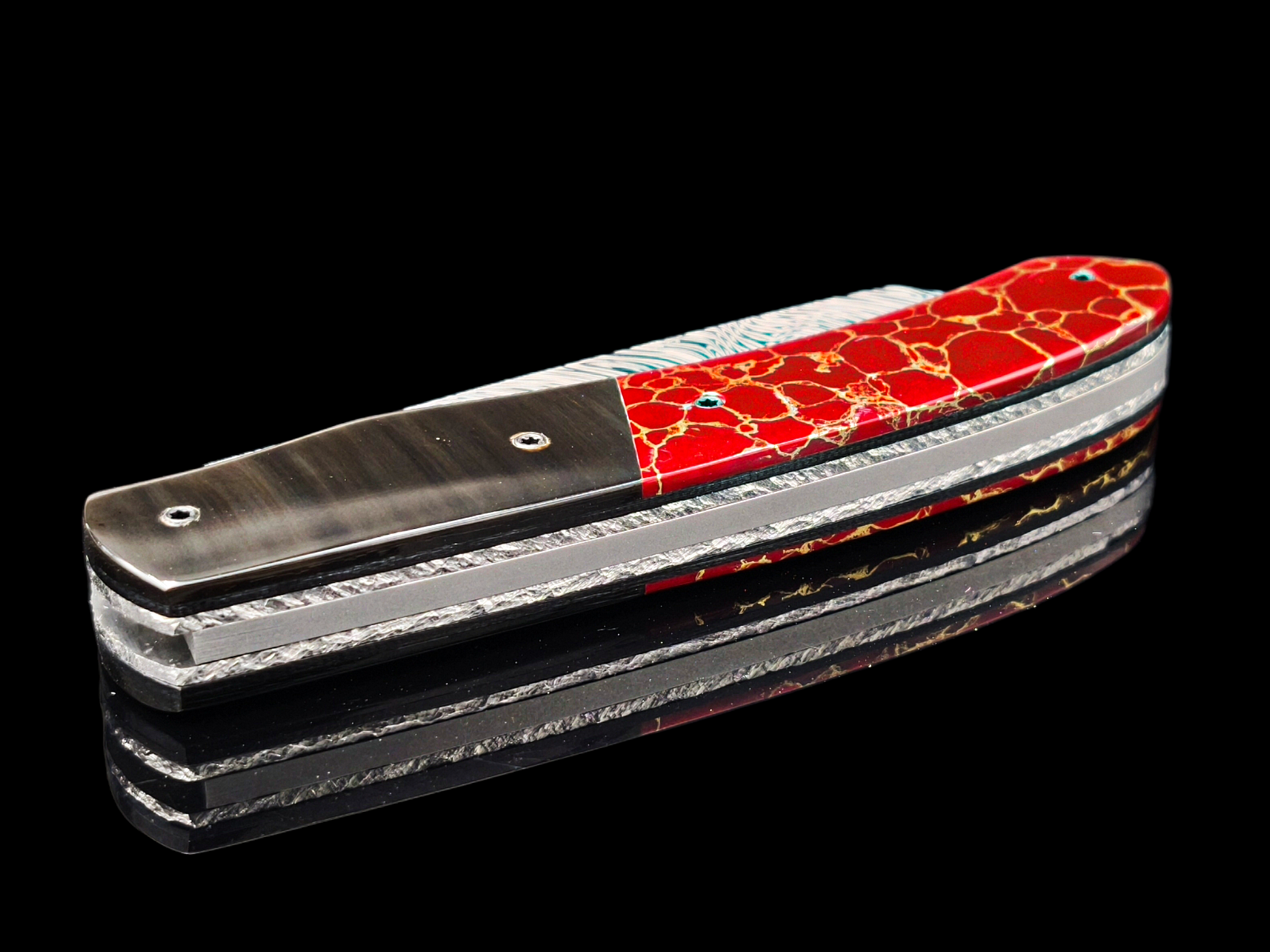 Sa lame en damas inoxydable, dont le motif évoque les écailles d’un dragon légendaire, reflète la puissance contenue et la sagesse de celui qui domine sans jamais s’emporter.