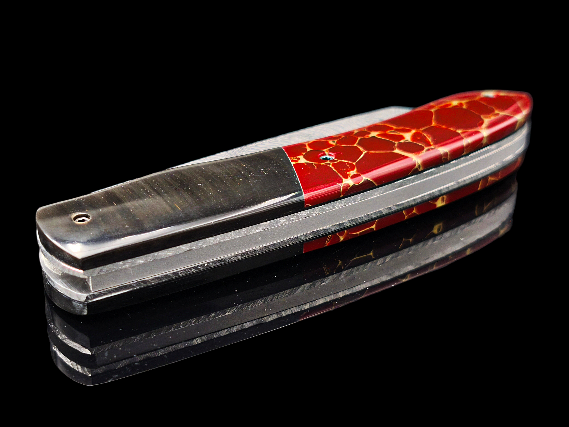 Sa lame en damas inoxydable, dont le motif évoque les écailles d’un dragon légendaire, reflète la puissance contenue et la sagesse de celui qui domine sans jamais s’emporter.