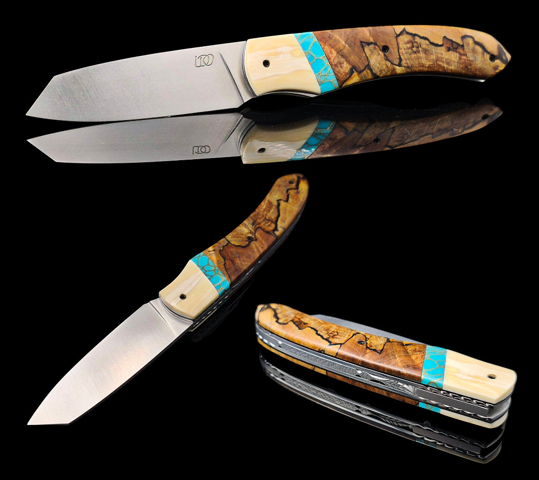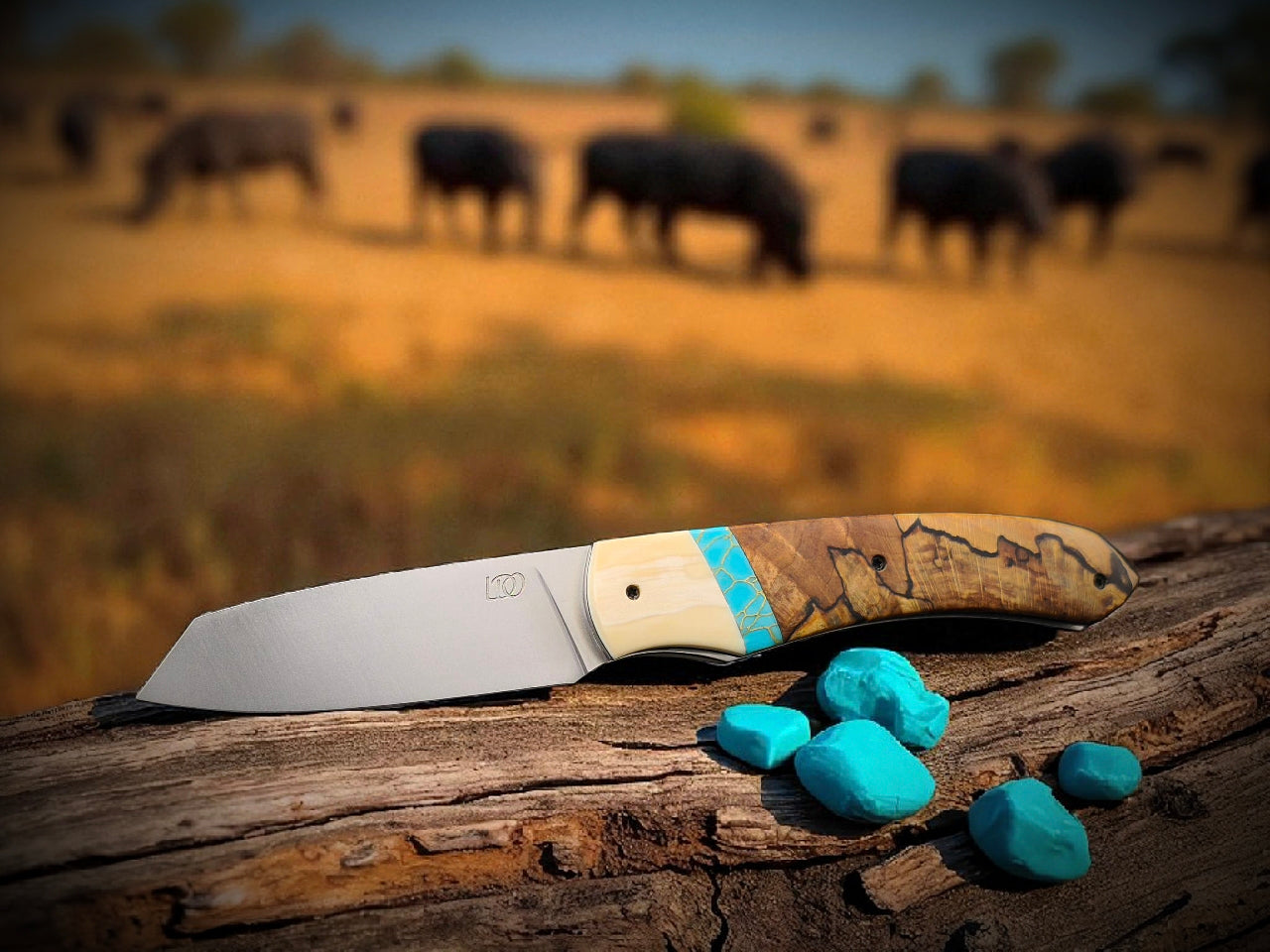Manche en ivoire de phacochère, Turquoise et fils d'or, Hêtre échauffé.