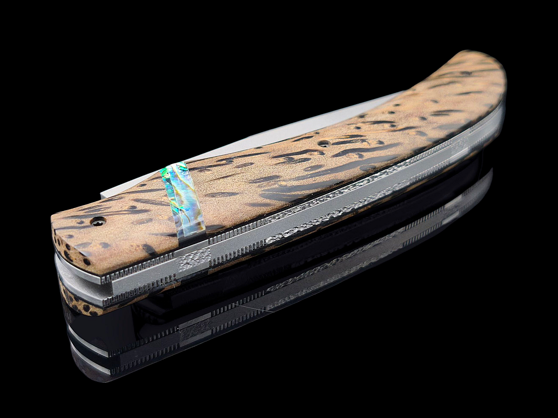 Un guillochage délicat vient orner le dos du couteau, scintillant comme des cristaux de sel sous le soleil.